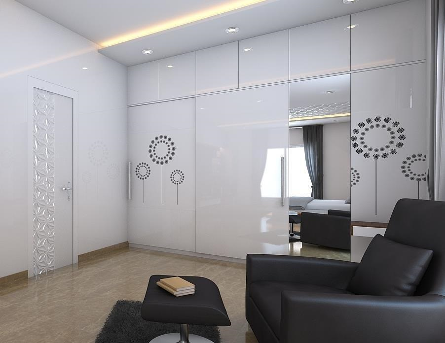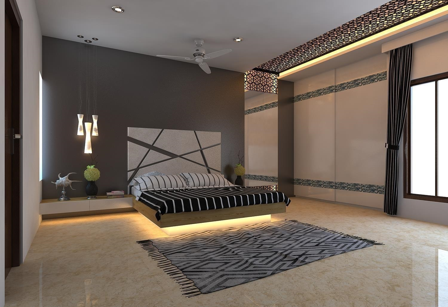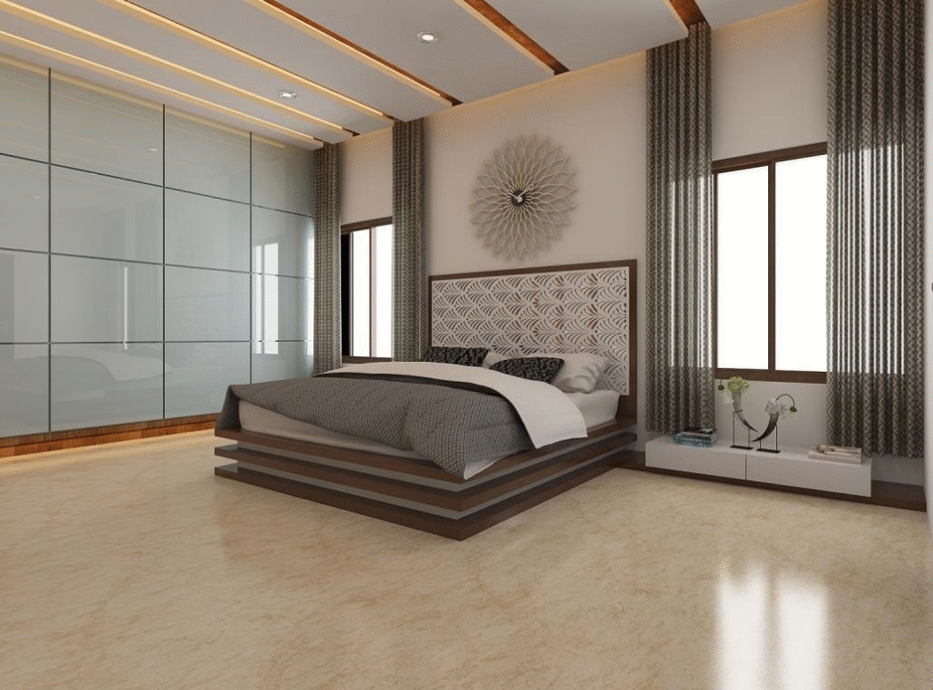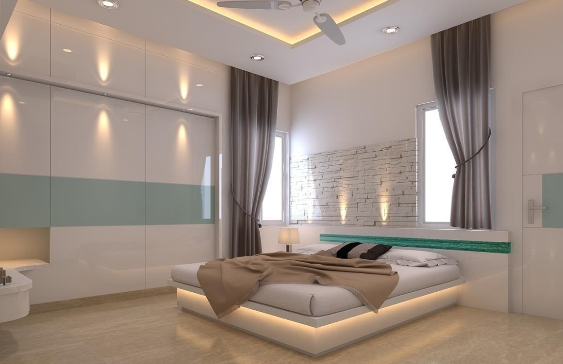 False ceilings are designed with cove and accent lighting to enhance spatial depth and define